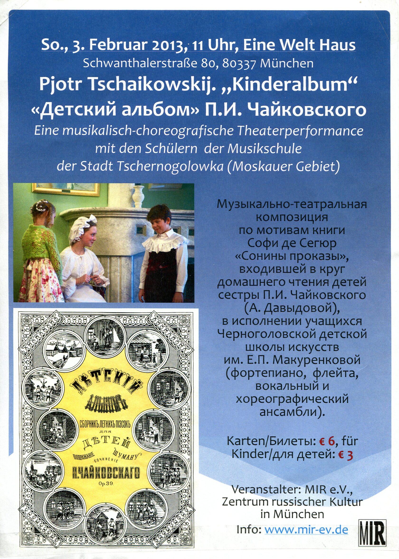 Особенно благодатным для комплексной работы стал цикл фортепианных пьес «Детский альбом» П. И. Чайковского, к которому преподаватели школы обращались неоднократно, апробируя разные методы и формы. Лекция-концерт «Детский альбом» П. И. Чайковского, проведенная И. Н. Рудольской, в котором 24 фортепианные пьесы были исполнены учащимися класса О. С. Агроскиной, стала отправной точкой создания сценария и постановки музыкального спектакля. Предложенная педагогами оригинальная версия драматургической концепции цикла ставила задачей исполнение всех 24 фортепианных пьес в том порядке, который сле довал в авторском варианте. В спектакле пьесы, написанные для фортепиано, исполнялись в переложении для различных инструментальных ансамблей, для хора, вокала, фольклора, с участием хореографии. Изучая вместе с учениками произведения П. И. Чайковского, преподаватели хотели, чтобы дети погрузились в атмосферу того времени, в котором жил и творил компози тор. Поэтому сюжетная линия строилась на эпизодах из жизни самого П. И. Чайковского и его ближайшего окружения. Материалом также послужили книги Софи де Сегюр (в девичестве графини Растопчиной) «Сонины проказы» и «Каникулы», входившие в круг домашнего чте ния у племянников Чайковского, детей Александры Ильиничны.